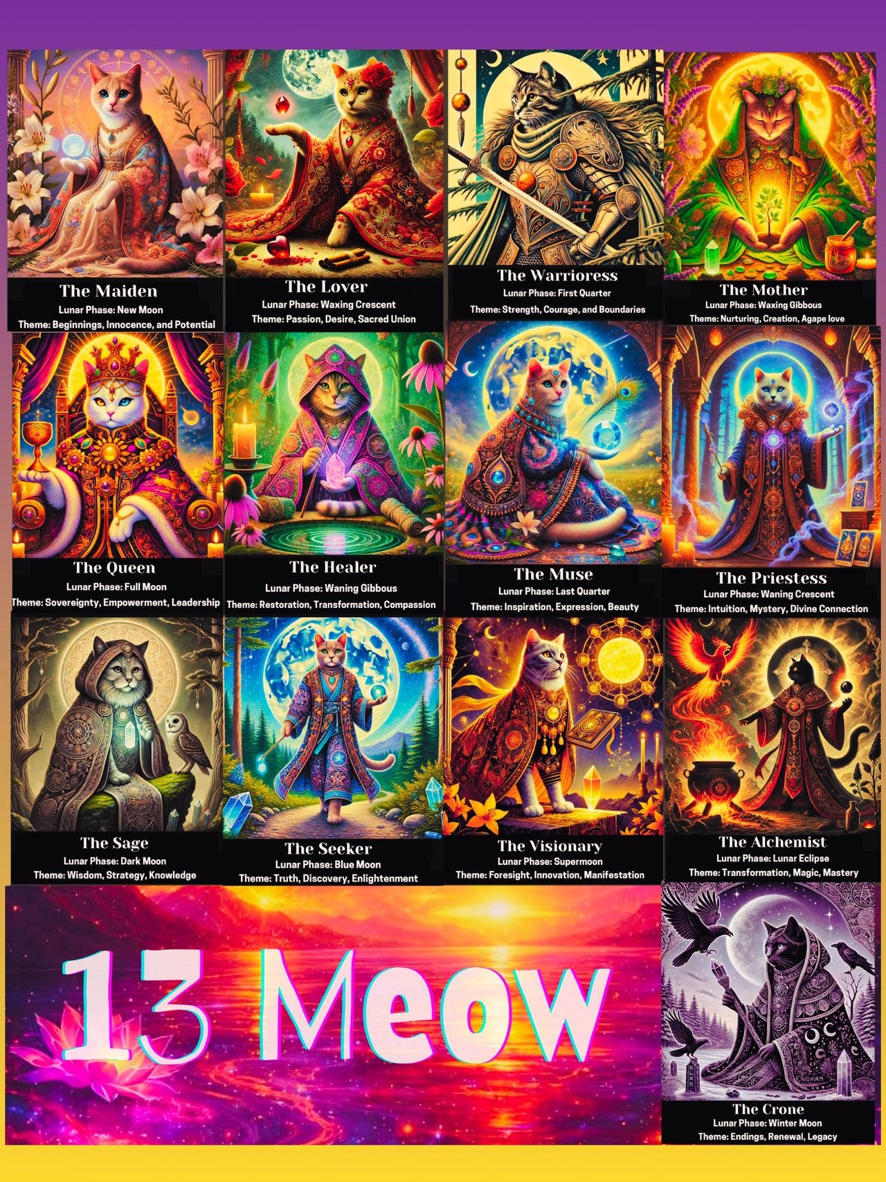 This companion invites you to listen, feel, and recognize which feline archetype is moving through you now — and how each thread contributes to your own unfolding story.
