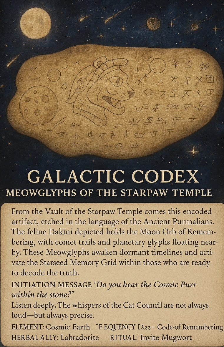 “From the Vault of the Starpaw Temple comes this encoded artifact, etched in the language of the Ancient Purrnalians. The feline Dakini depicted holds the Moon Orb of Remembering, with comet trails and planetary glyphs floating nearby. These Meowglyphs awaken dormant timelines and activate the Starseed Memory Grid within those who are ready to decode the truth.”