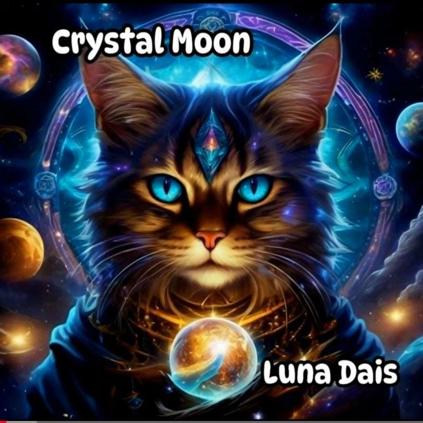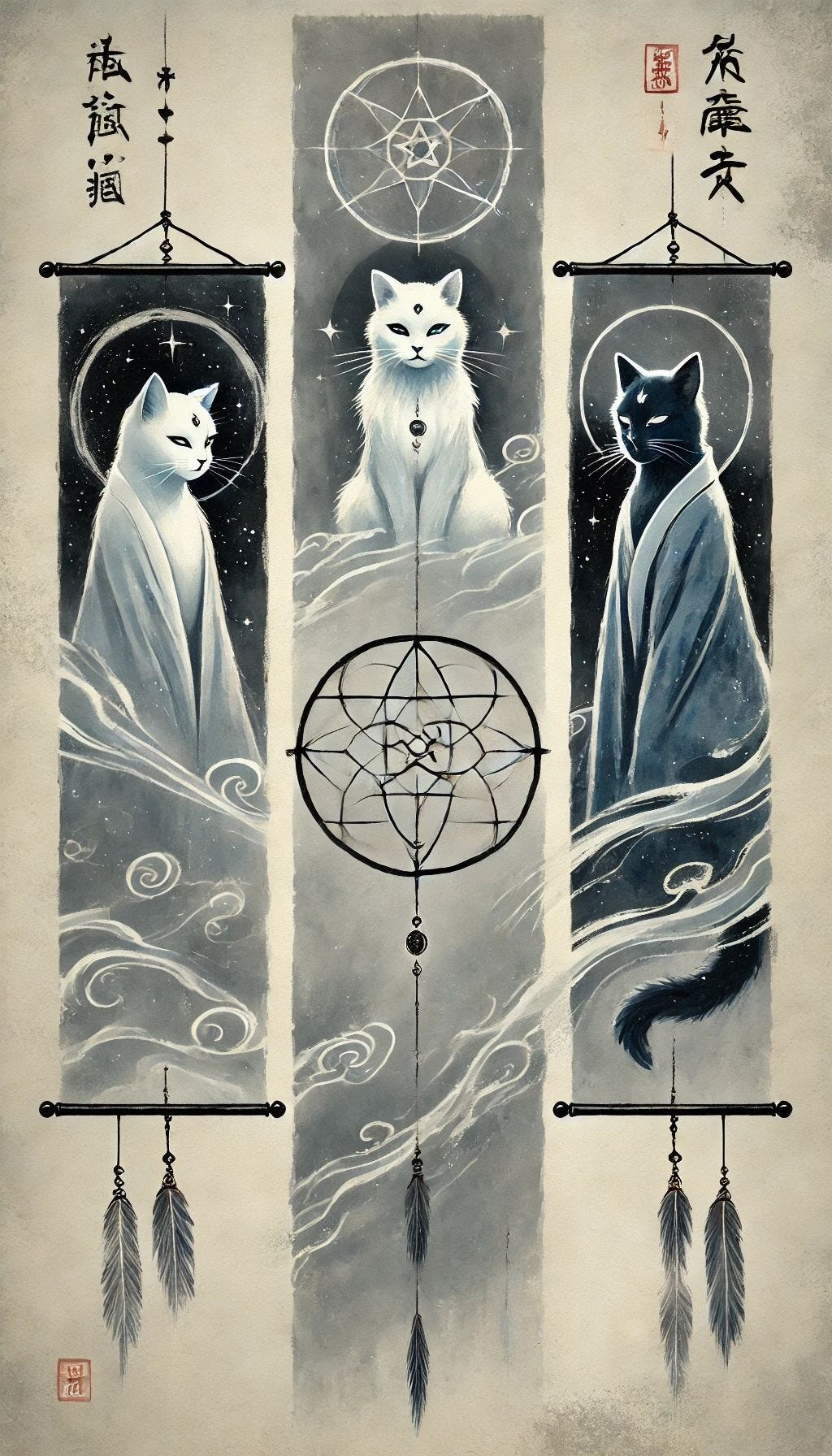 A vertical hanging scroll with an image of the Crystal Moon cat at the top, crescent moons and crystalline patterns along the sides, with the following central mantra poem inscribed in glowing starlight script.