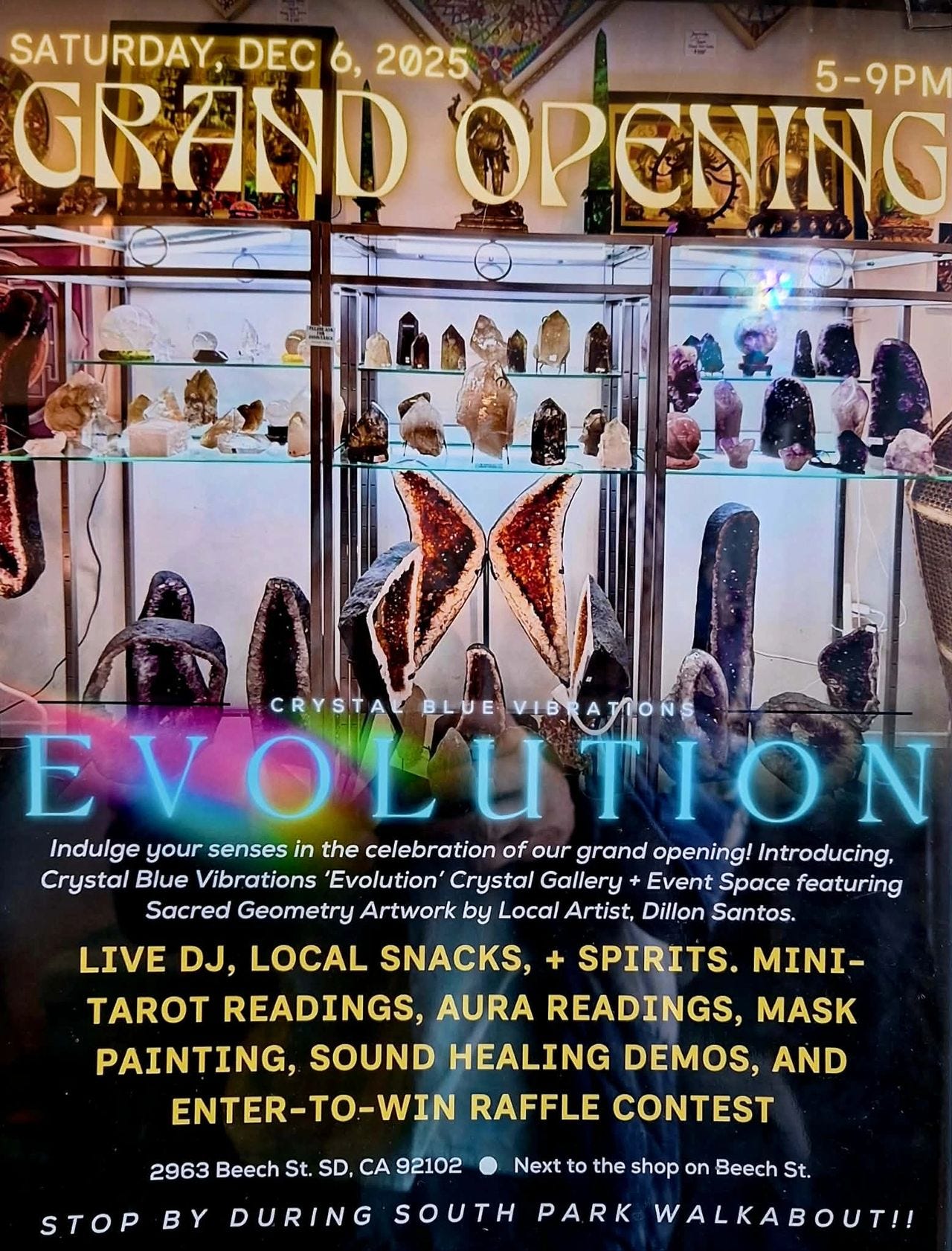 On Saturday, December 6, 2025, from 5â9 PM, Crystal Blue Vibrations opens the doors to âEvolutionââa new Crystal Gallery + Event Space designed to celebrate art, community, and immersive experiences at the intersection of beauty and consciousness.