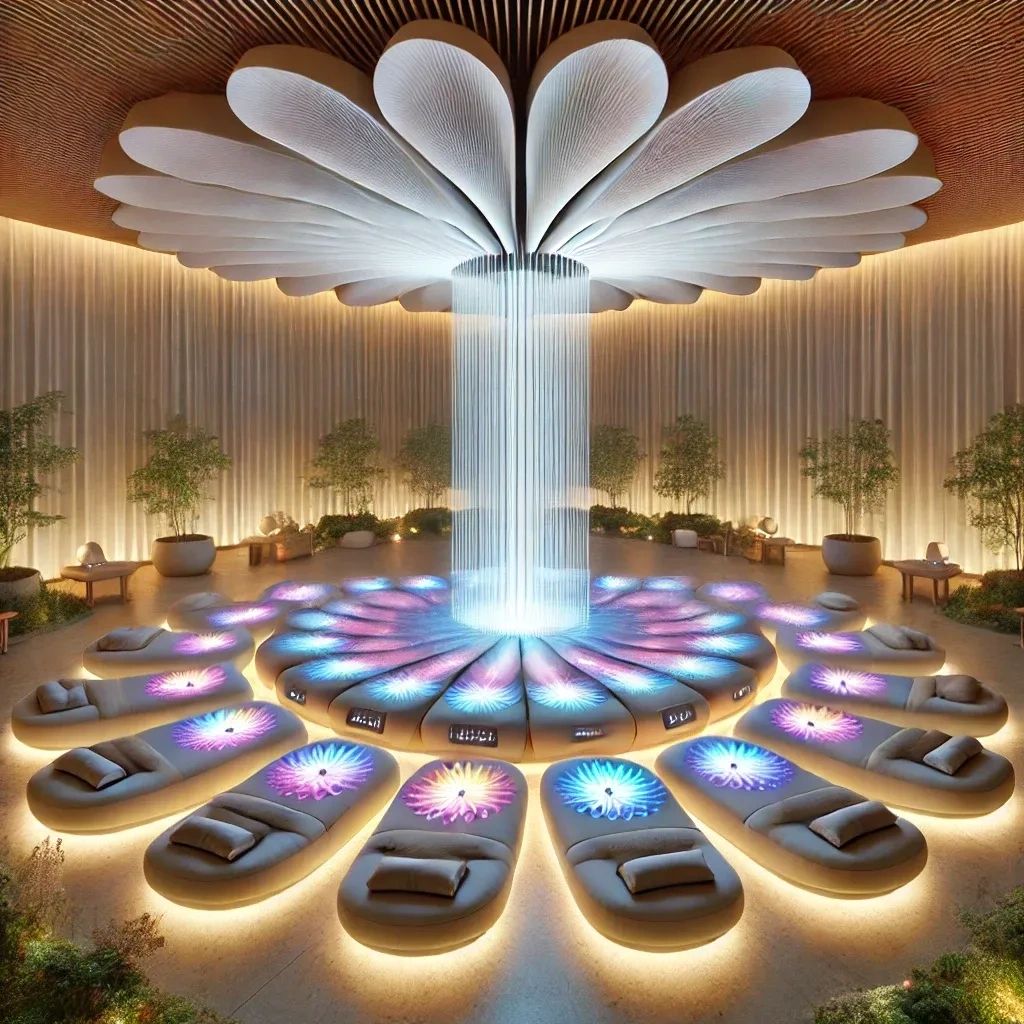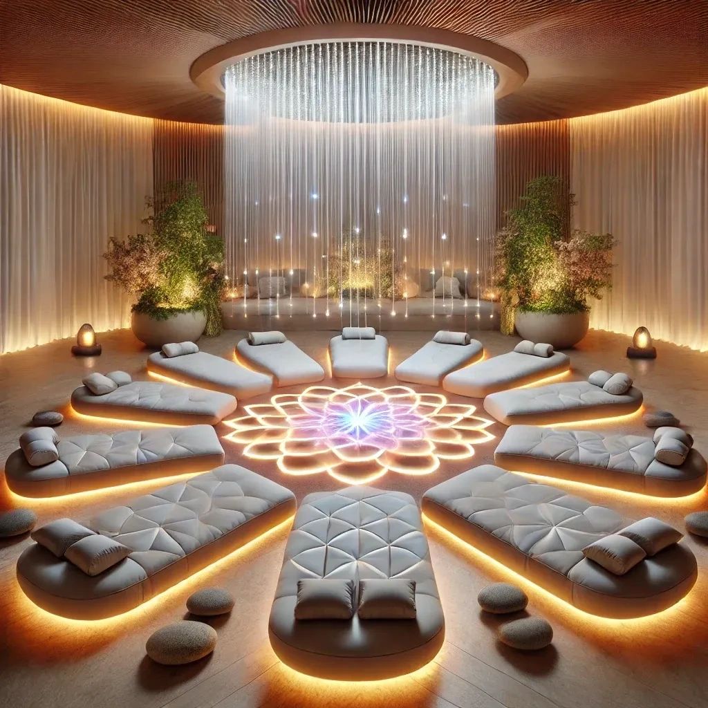 🌸 Daisy Circle Activation with Roxiva Brain Wave Entrainment (6:30 PM - 7:00 PM) Participants form a sacred Daisy Circle around the Roxiva Lamp, lying down with heads towards the center, experiencing a group brainwave entrainment session that synchronizes mind and heart frequencies through light, sound, and geometry.