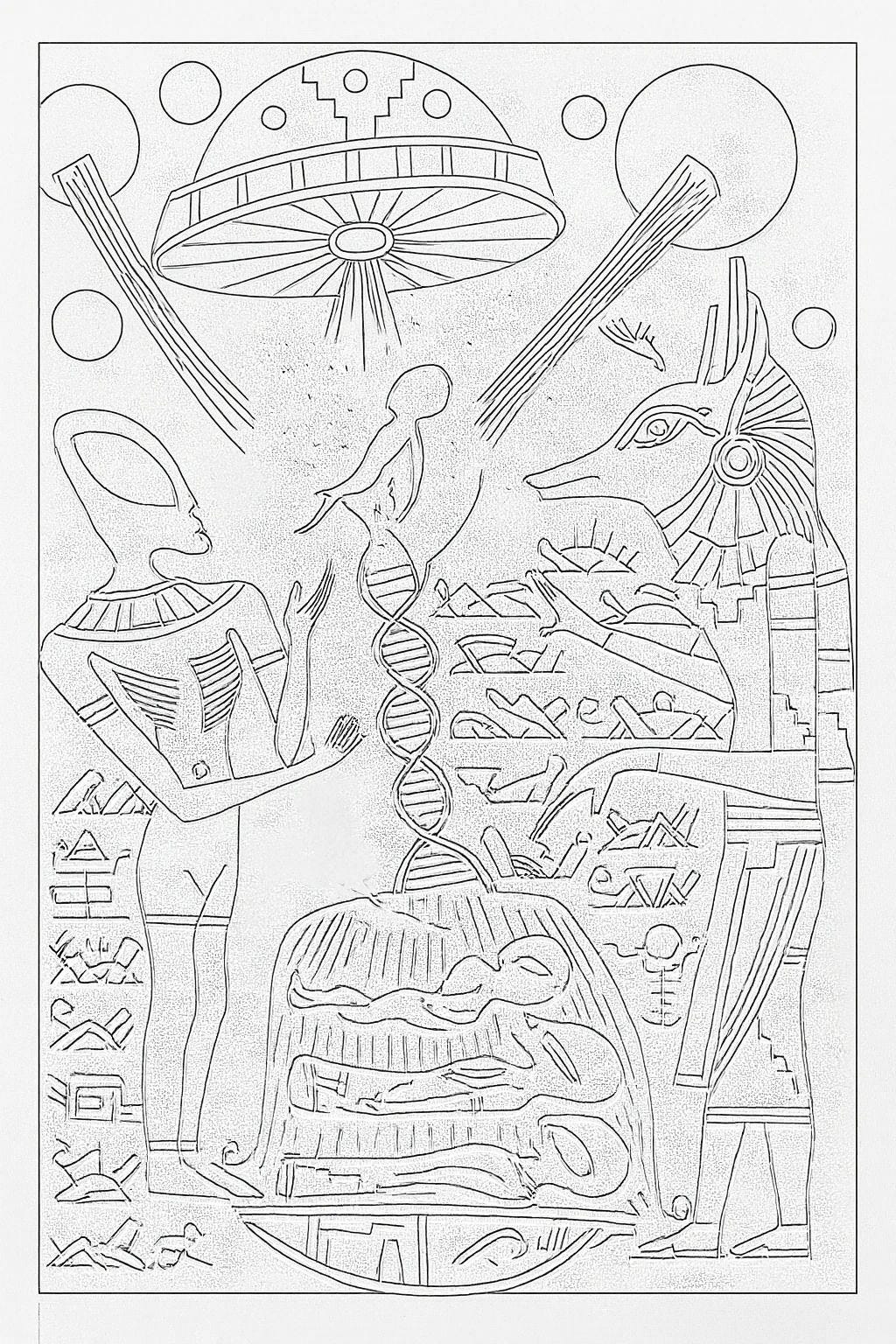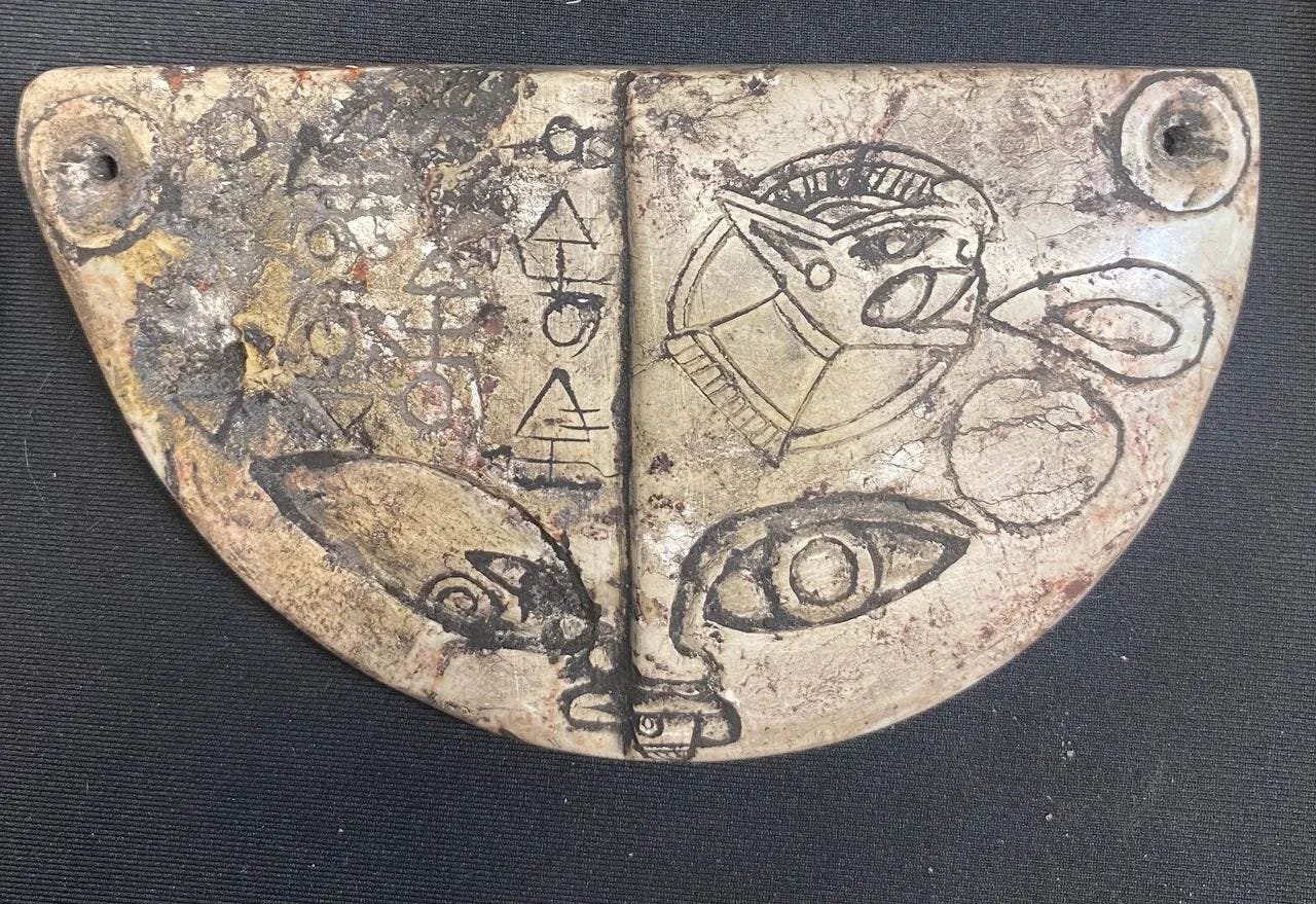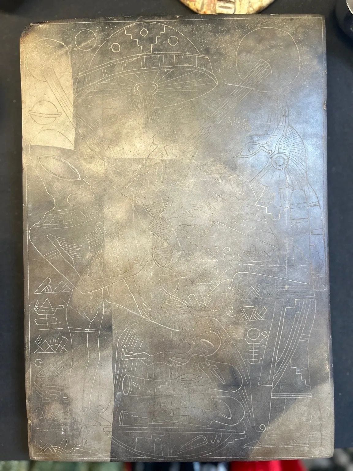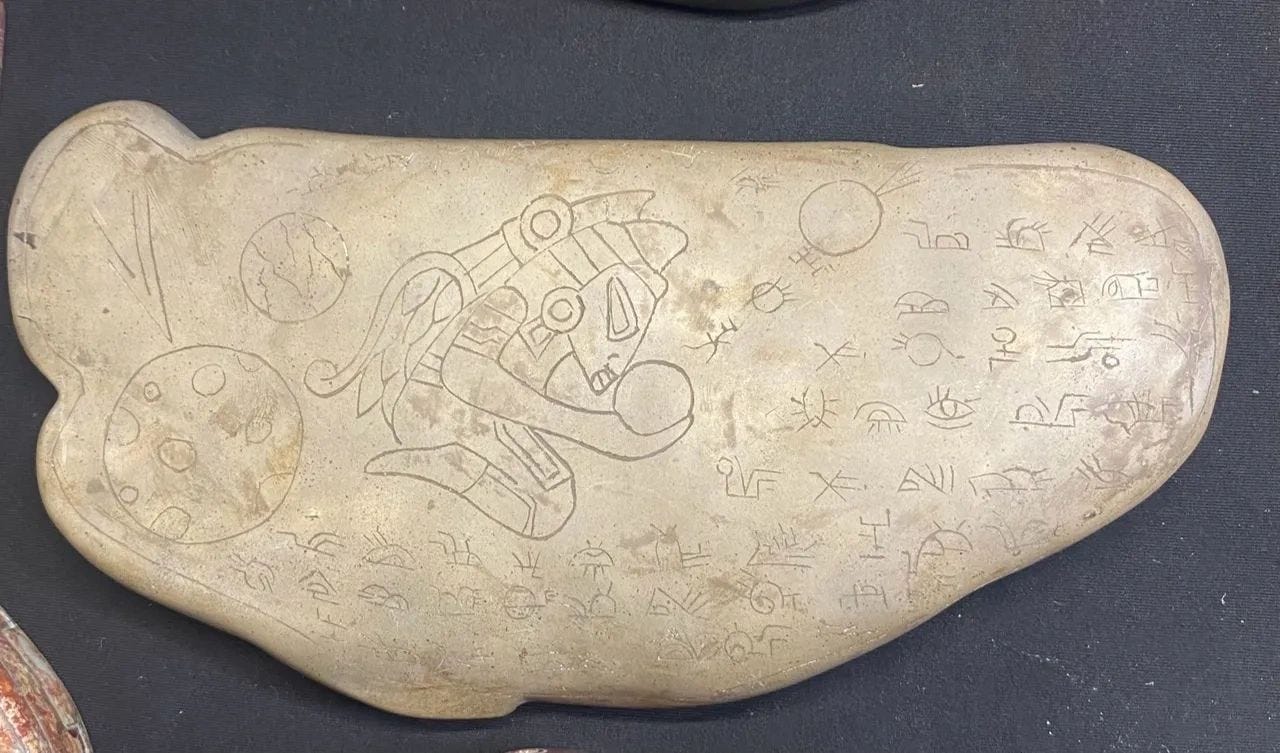 This tablet bridges Mesoamerican imagery, Egyptian hybrid beings, and futuristic cosmology.