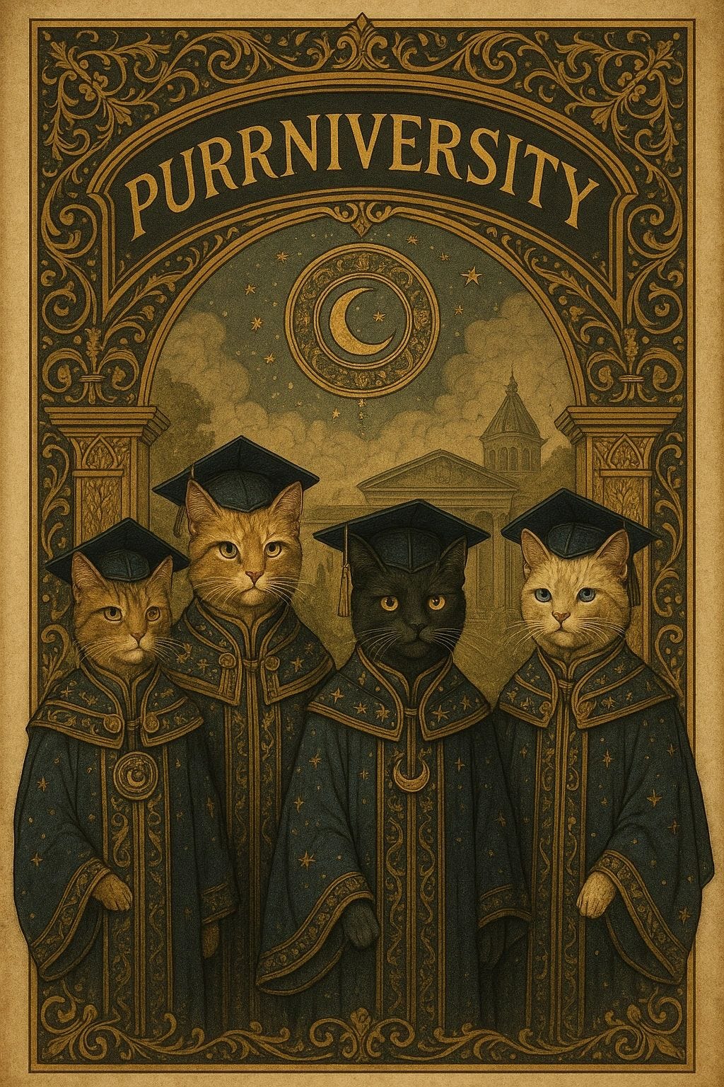 At its cosmic core, the Purrniversity is a non-linear, non-verbal, and fur-covered research institute where the study of human behavior has been elevated to a sacred science.